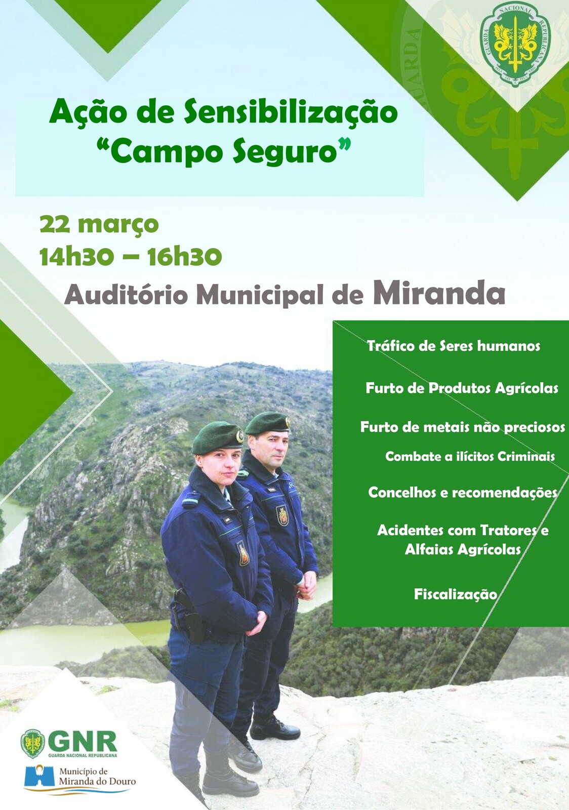 O Comando Territorial de Bragança da Guarda Nacional Republicana, através do Destacamento Territorial de Miranda do Douro - Núcleo de Proteção Ambiental, vai promover a ação de sensibilização, direcionada à população em geral, sobre a temática de “Campo Seguro”, a realizar no Miniauditório Municipal, no dia 22 de março de 2024, entre as 14h30 e as 16h30.