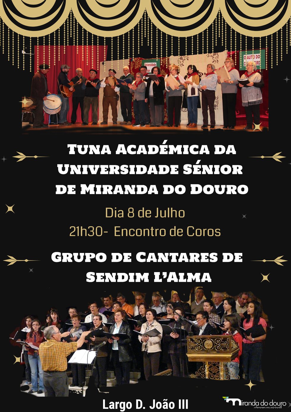 Dia 08 de Julho, pelas 21:30h, no Largo D. João III, Animação Musical com o Grupo de Cantares de Sendim - L'Alma e a Tuna Académica da Universidade Sénior de Miranda do Douro.