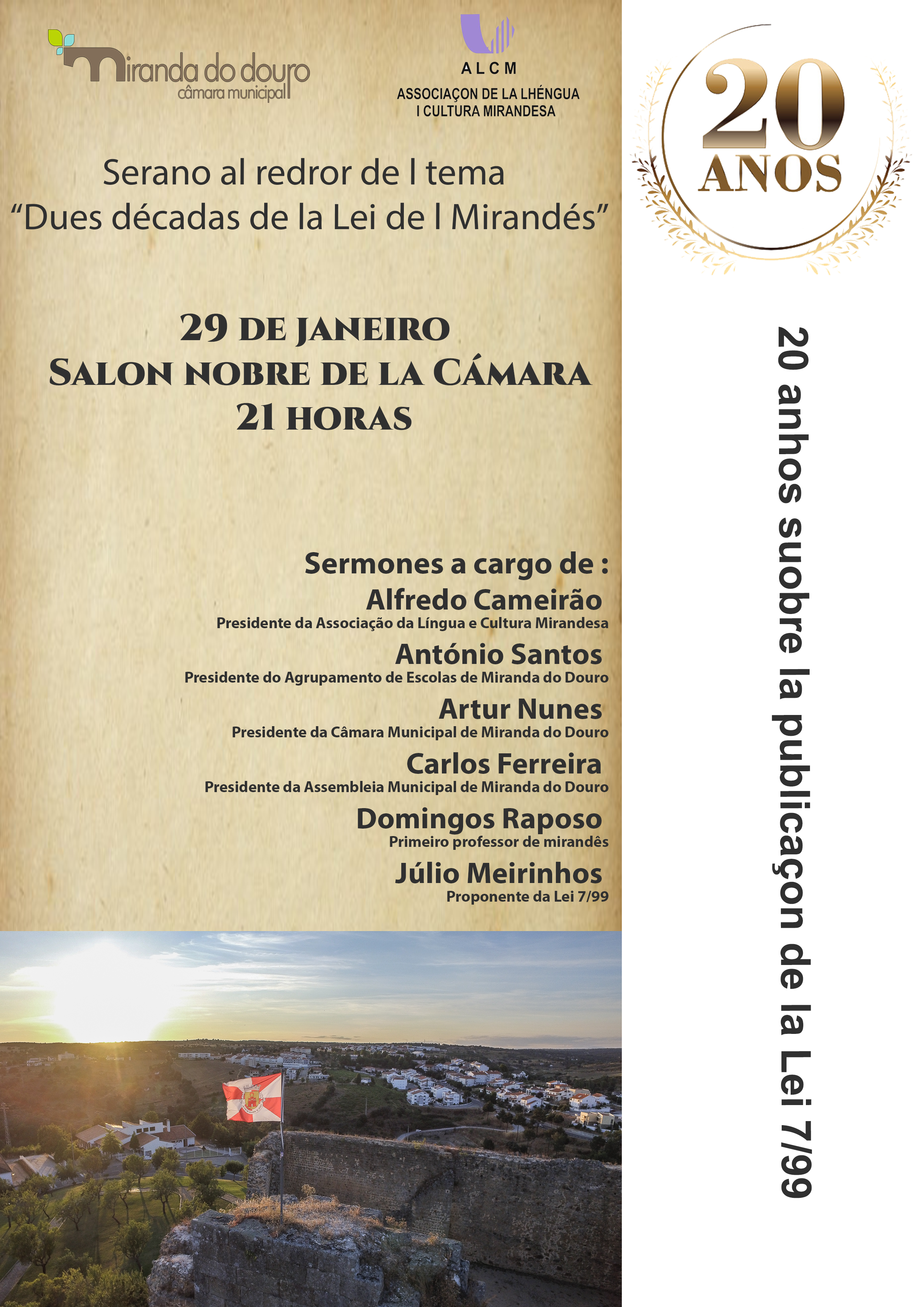L die 29 de janeiro, la Cámara de Miranda de l Douro i la Associaçon de la Lhéngua i Cultura Mirandesa márcan la passaige de 20 anhos suobre la publicaçon de la Lei 7/99 cun un serano al redror de l tema “Dues décadas de la Lei de l Mirandés”. La tertúlia será no salon nobre de la Cámara, a las 9 horas de la nuite, i ajuntará alguas de las personas i representantes dalguas de las anstituiçones más arrimadas anstitucionalmente a la lhéngua mirandesa. La oucasion bai a serbir tamien para que las dues anstituiçones ourganizadoras anúncien amportantes medidas feturas para fortalecer i promober la lhéngua mirandesa.