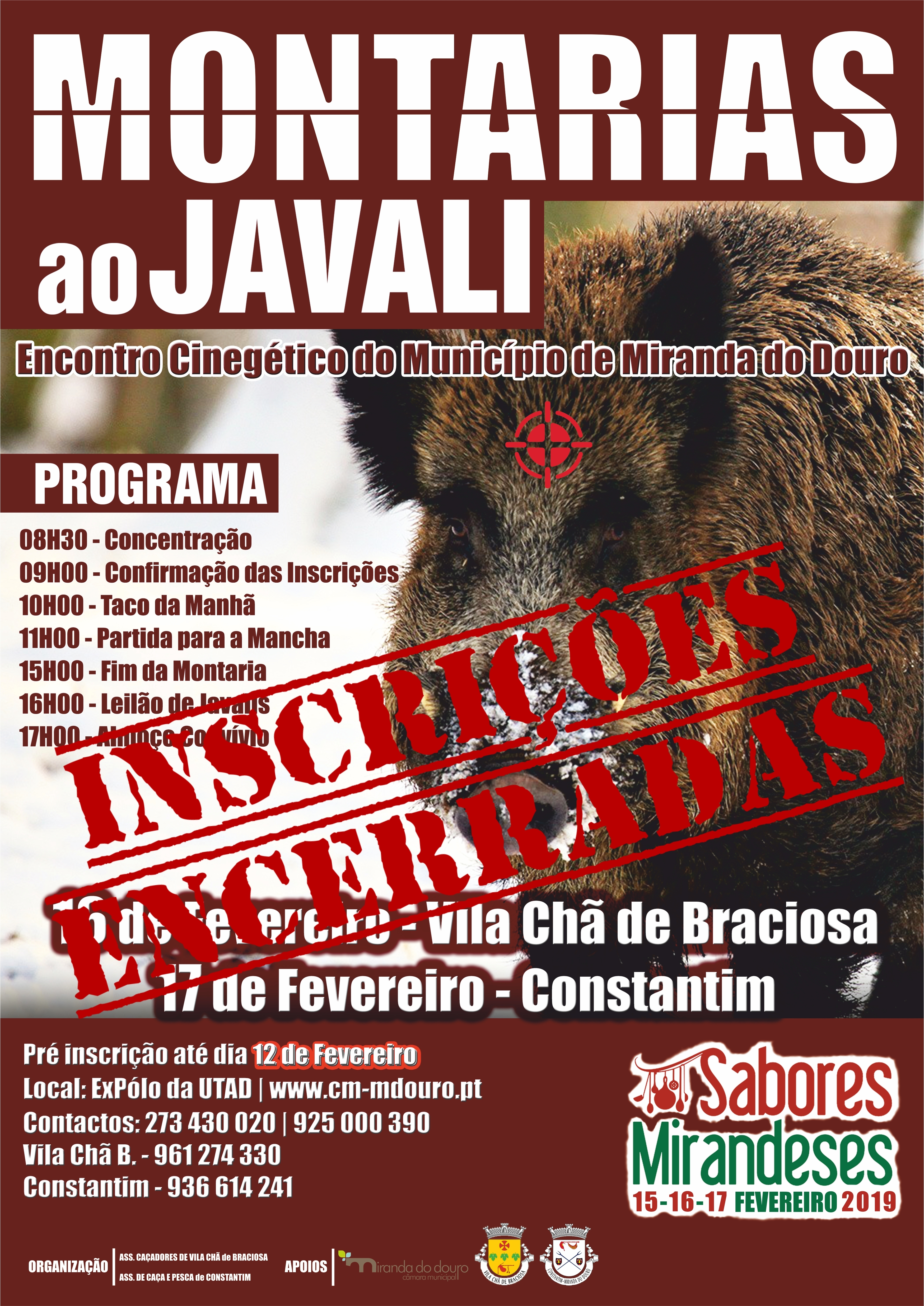 Inserido no Festival de Sabores Mirandeses (15, 16 e 17 de fevereiro 2019), o Encontro Cinegético do Concelho de Miranda do Douro vem oferecer a todos os aficionados a realização de duas Montarias ao Javali, dia 16 de fevereiro em Vila Chã de Braciosa e dia 17 de fevereiro em Constantim. Ambos os encontros são organizados pelas Associação de Caçadores de Vila Chã de Braciosa e Associação de Caça e Pesca de Constantim, respetivamente, com o apoio do Município de Miranda do Douro.