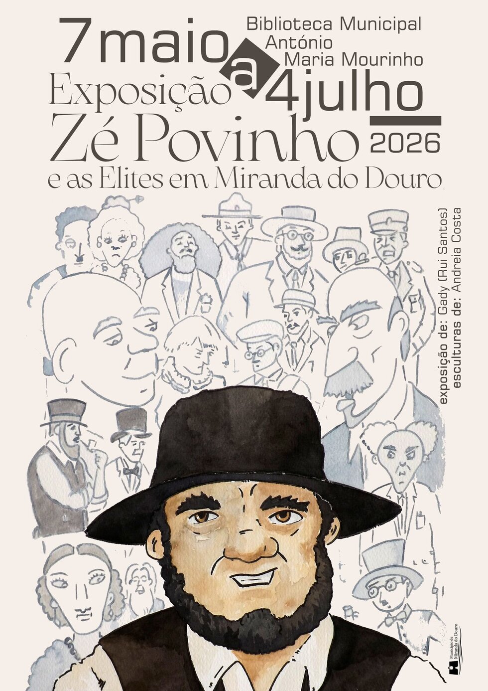 De 7 de maio a 4 de julho de 2026, a Biblioteca Municipal António Maria Mourinho acolhe a exposição de Gady (Rui Santos) "Zé Povinho e as Elites em Miranda do Douro", com esculturas de Andreia Costa.