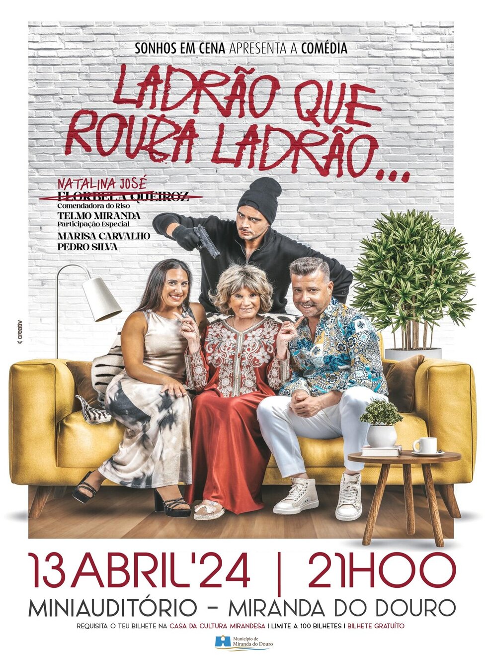 "Ladrão que Rouba Ladrão" é o nome da comédia à portuguesa que subirá ao palco do Miniauditório de Miranda do Douro no próximo dia 13 de abril pelas 21h00. Por motivos completamente alheios ao município, o elenco sofrerá alterações, sendo a atriz Florbela Queiroz substituida pela, não menos talentosa, Natalina José, que se juntará a Telmo Miranda, Marisa Carvalho e Pedro Silva neste espetáculo imperdível.