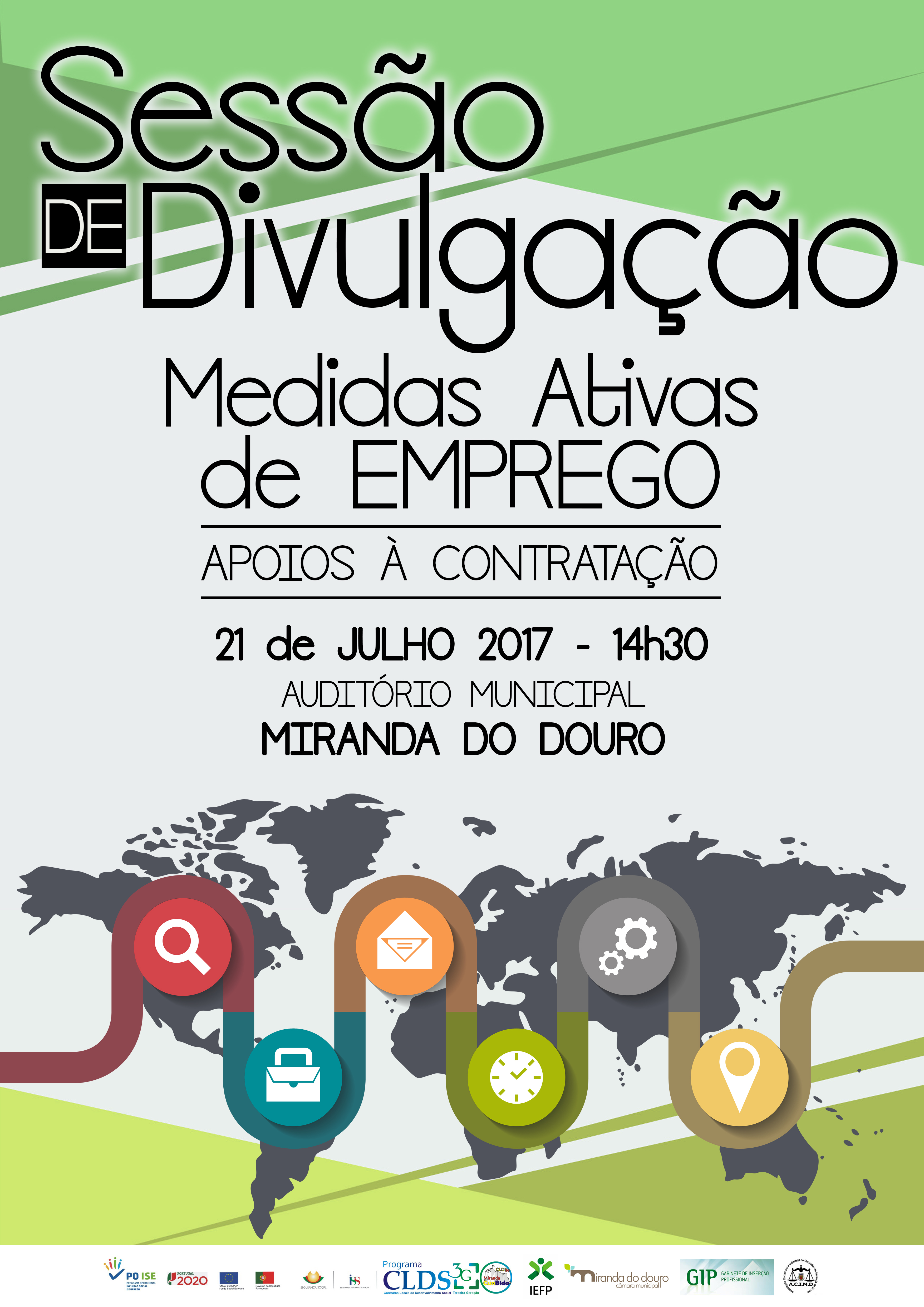 O CLDS-3G «Miranda CunBida» e o Gabinete de Inserção Profissional (GIP) de Miranda do Douro, têm a honra de o convidar a estar presente na sessão de divulgação sobre as medidas ativas de emprego - apoio à contratação, a realizar dia 21 de Julho pelas 14h30m, no Auditório Municipal, em Miranda do Douro.