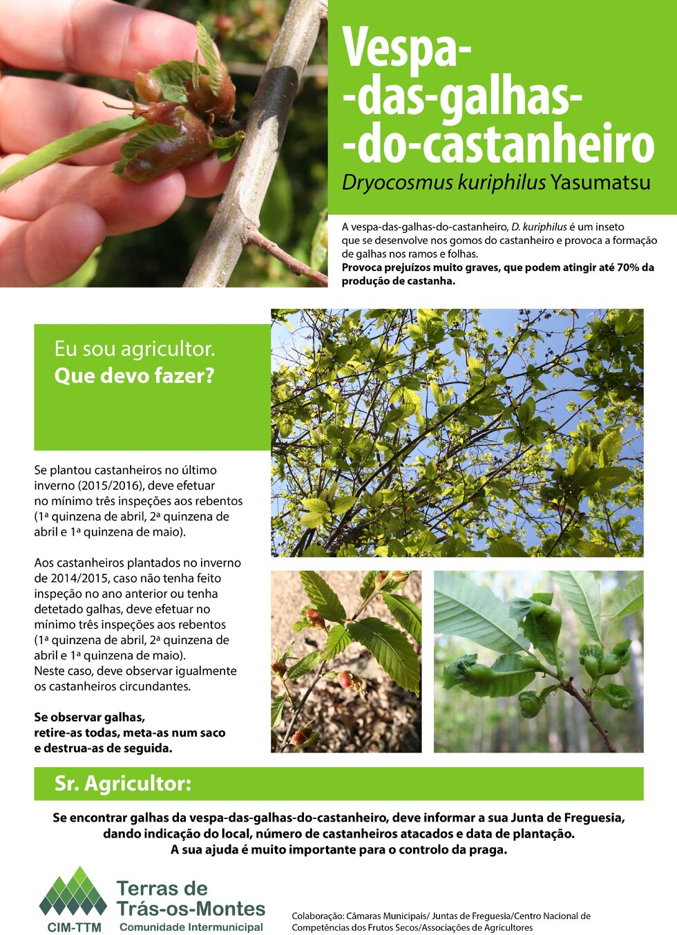 Foi recentemente detectado um foco de Vespa das Galhas do Castanheiro numa plantação jovem, no concelho de Miranda do Douro. Como é de conhecimento geral, esta vespa provoca prejuízos muito graves na produção de castanha. Nesse sentido, Artur Nunes, Presidente da Câmara Municipal de Miranda do Douro, vem por este meio alertar a população para a necessidade urgente de efetuar a vigilância das suas plantas. Esta é uma preocupação do Município, que desde alguns anos organiza sessões de esclarecimento onde é abordado a temática.