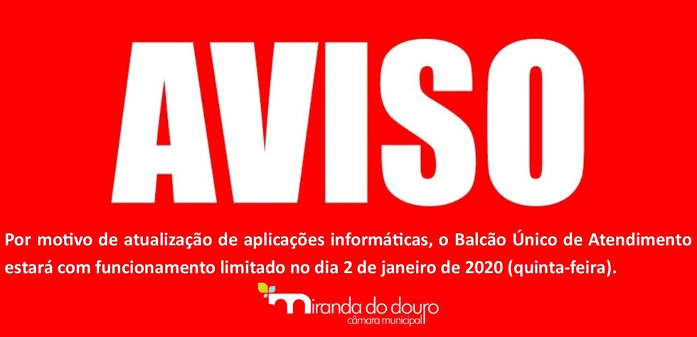 O Município de Miranda do Douro informa que por motivo de atualização de aplicações informáticas, o Balcão Único de Atendimento estará com funcionamento limitado no dia 2 de janeiro de 2020 (quinta-feira).