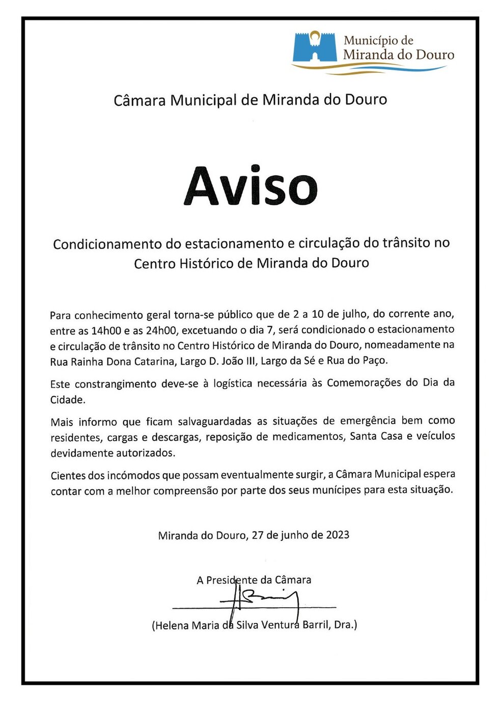 - AVISO | Condicionamento do estacionamento e circulação do trânsito no Centro Histórico de Miranda do Douro de 2 a 10 de julho