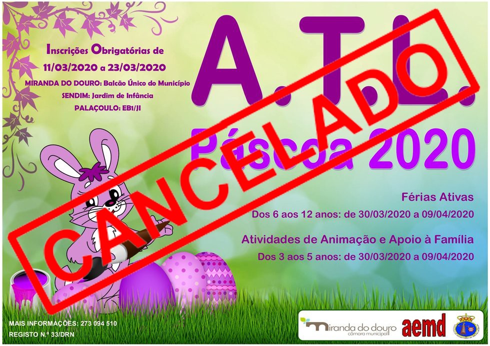 Informam-se os senhores(as) Encarregados(as) de Educação que, em virtude da suspensão das atividades letivas assim como dos ATL decretada ontem pelo Governo, o Município de Miranda do Douro irá cancelar os programas "Férias Ativas e Atividades de Animação e Apoio à Família" previstas para a interrupção letiva da Páscoa.