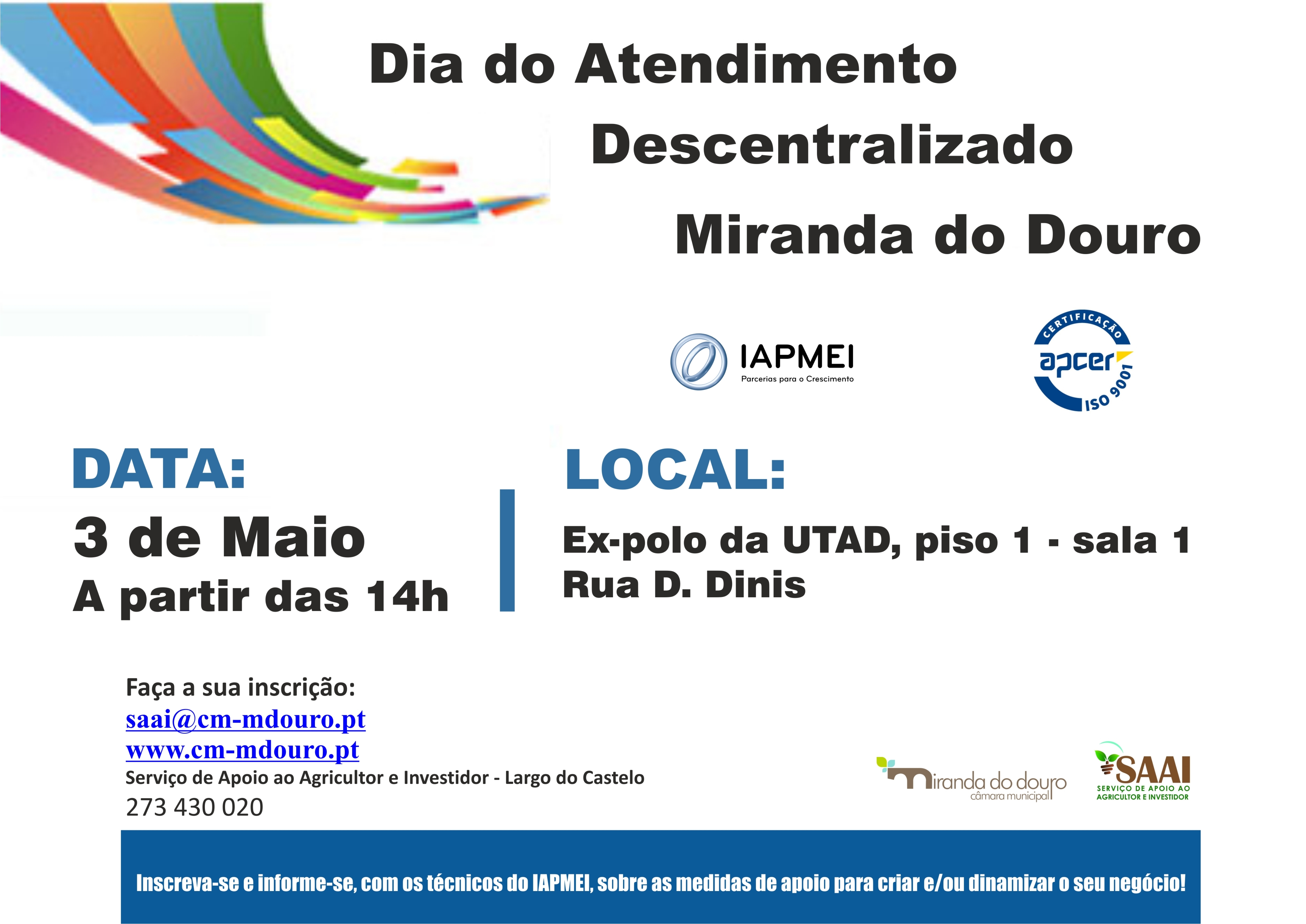 O IAPMEI - Agência para a Competitividade e Inovação, IP, em parceria com a Câmara Municipal de Miranda do Douro e em colaboração com o seu Serviço de Apoio ao Agricultor e Investidor, vai realizar no próximo dia 03/05/2018 a partir das 14h, o Dia do Atendimento Descentralizado.