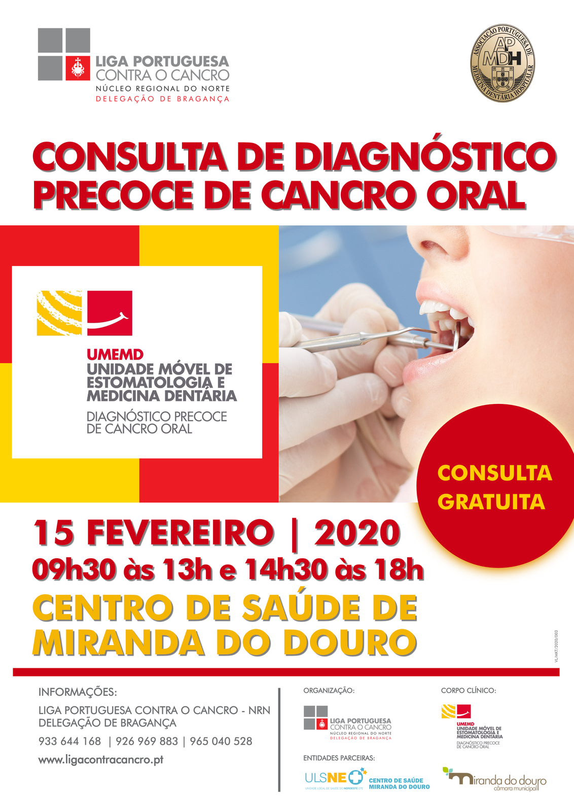 No âmbito da prevenção e promoção da saúde, a Delegação de Bragança da Liga Portuguesa Contra o Cancro-NRN, em estreita colaboração com a Associação Portuguesa de Medicina Dentária Hospitalar, a ULSNE através do Centro de Saúde de Miranda do Douro e a Câmara Municipal, organizam um Rastreio gratuito no dia 15 de fevereiro, a partir das 9 horas da manhã até às 18 horas do mesmo dia, no Centro de Saúde de Miranda do Douro.