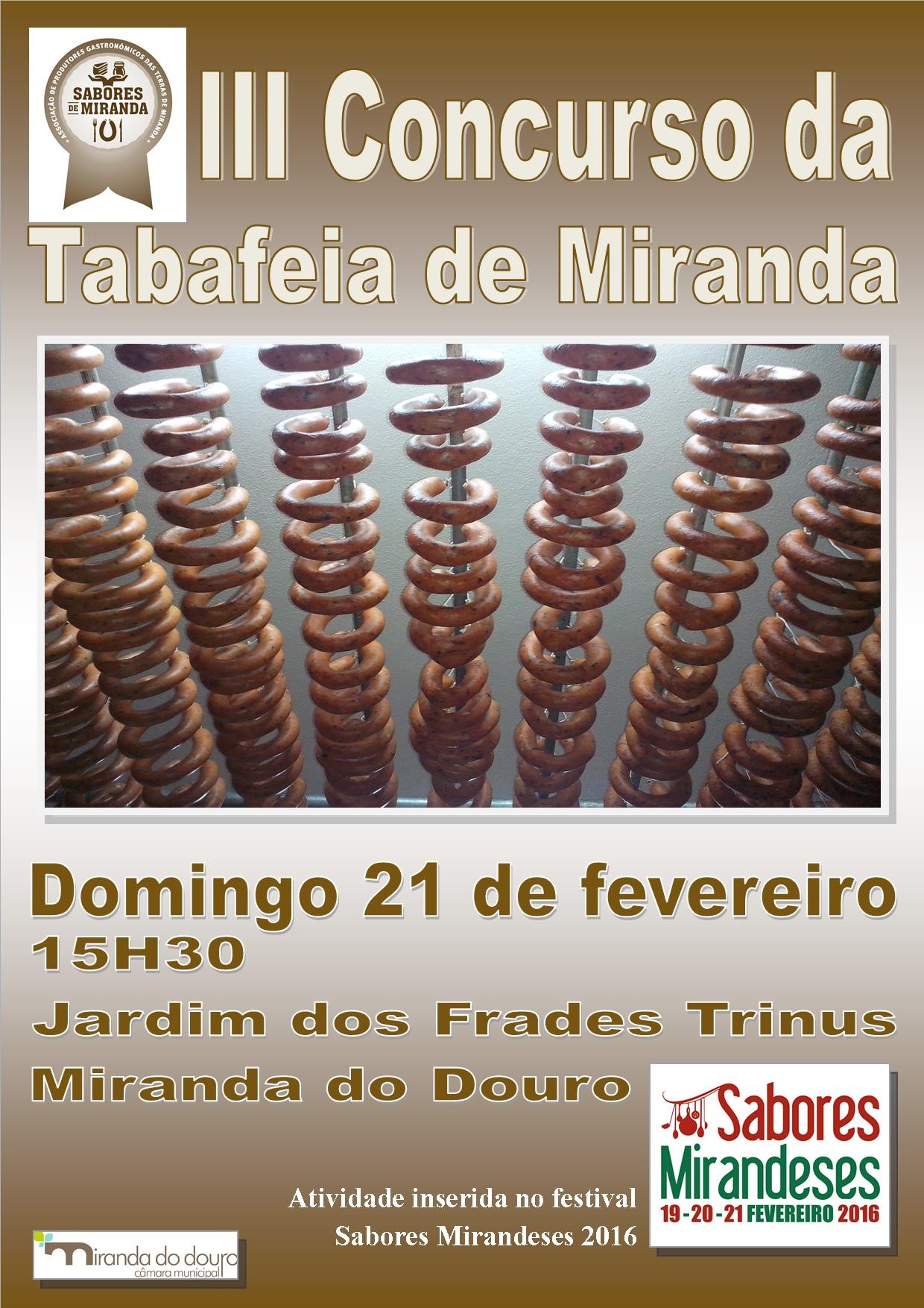 A Câmara Municipal de Miranda do Douro e a Sabores de Miranda – Associação de Produtores Gastronómicos das Terras de Miranda, promovem o III Concurso de Tabafeia, no dia 21 de Fevereiro, às 15h30, no Recinto do Jardim dos Frades Trinus.