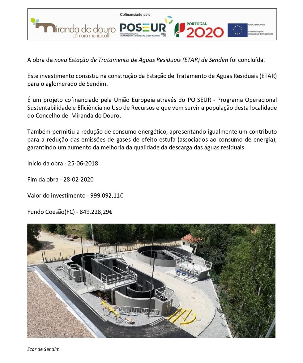 - Foi concluída a obra da nova Estação de Tratamento de Águas Residuais (ETAR) de Sendim