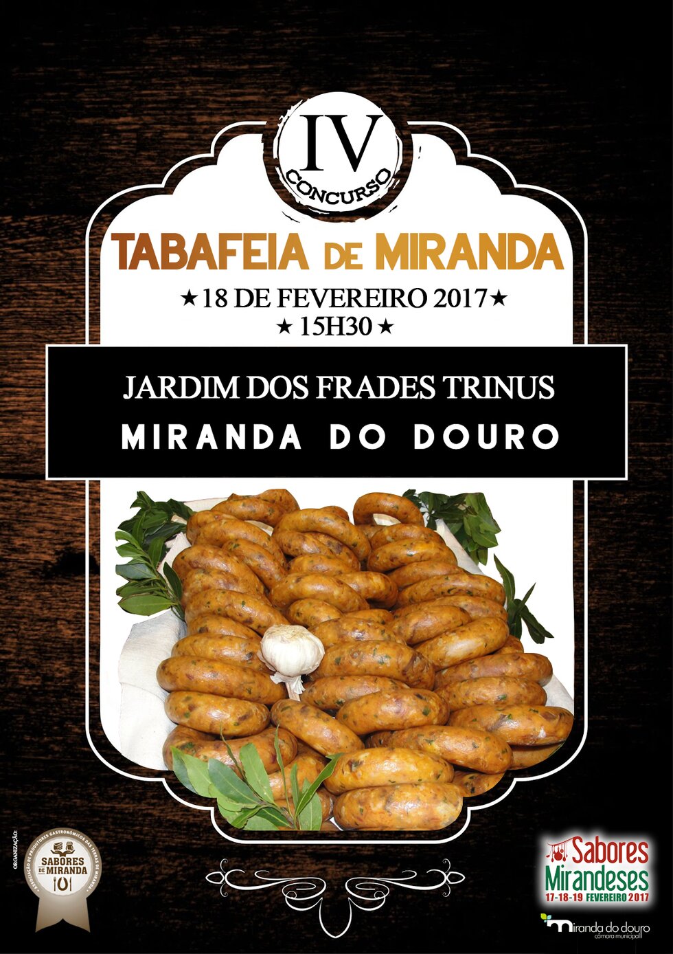 A Câmara Municipal de Miranda do Douro e a Sabores de Miranda – Associação de Produtores Gastronómicos das Terras de Miranda, promovem o IV Concurso de Tabafeia, no dia 18 de Fevereiro, às 15h30, no Recinto do Jardim dos Frades Trinus, inserido no Festival de Sabores Mirandeses, que irá decorrer de 17 a 19 de Fevereiro.