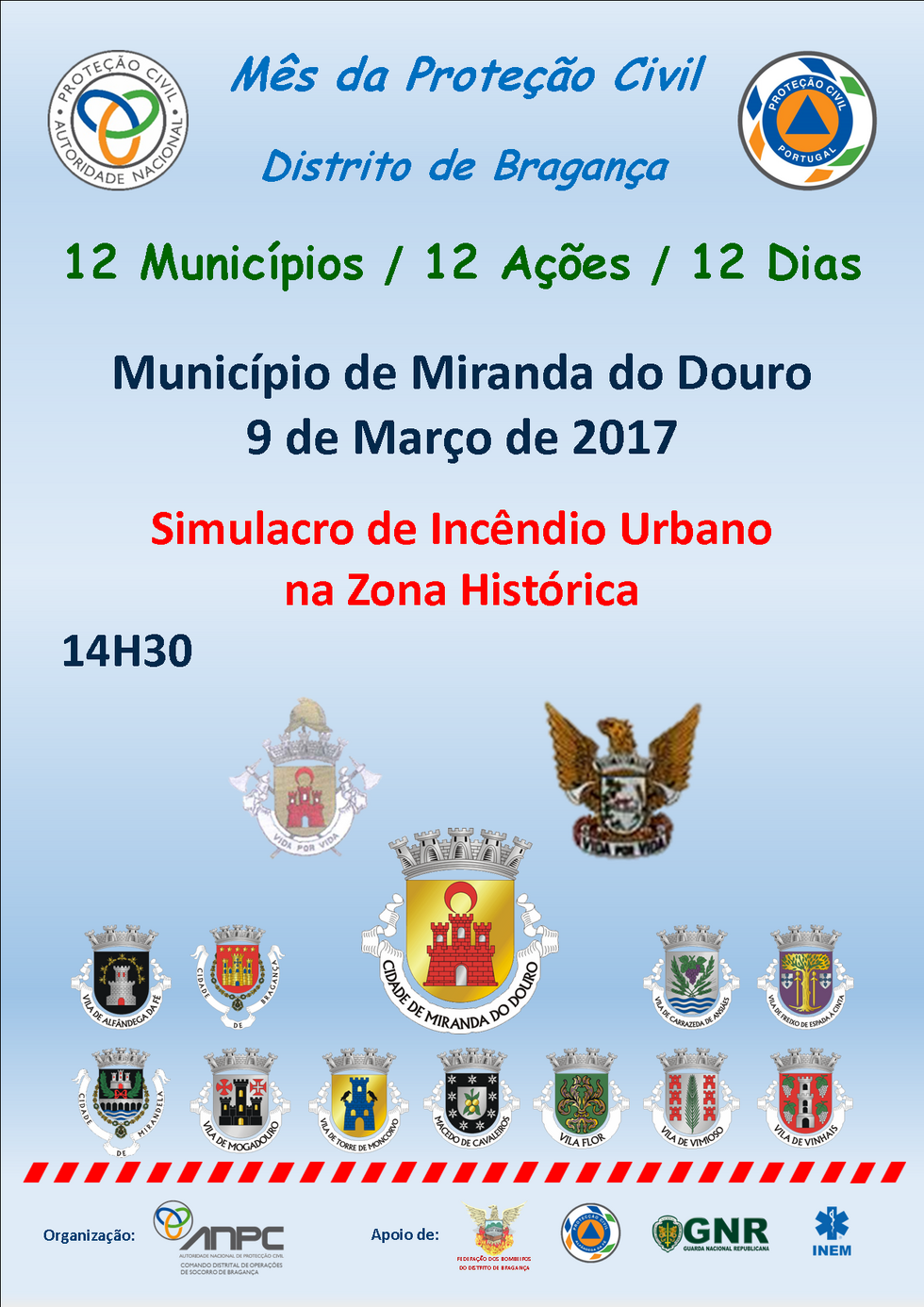 Em Miranda do Douro o exercício proposto será um incêndio urbano na zona histórica, que decorrerá no dia 09 de março de 2017, a partir das 14h30. Este exercício, que está a ser preparado pelo CDO...S e pelo Município de Miranda do Douro, em colaboração com as Corporações de Bombeiros Voluntários de Miranda do Douro e Sendim, e apoio Guarda nacional Republicana – Destacamento de Miranda do Douro, vai permitir testar os procedimentos operacionais e tempos de resposta das equipas intervenientes, nomeadamente no que concerne à mobilização, despacho, movimento, intervenção e sustentação das operações de resposta.