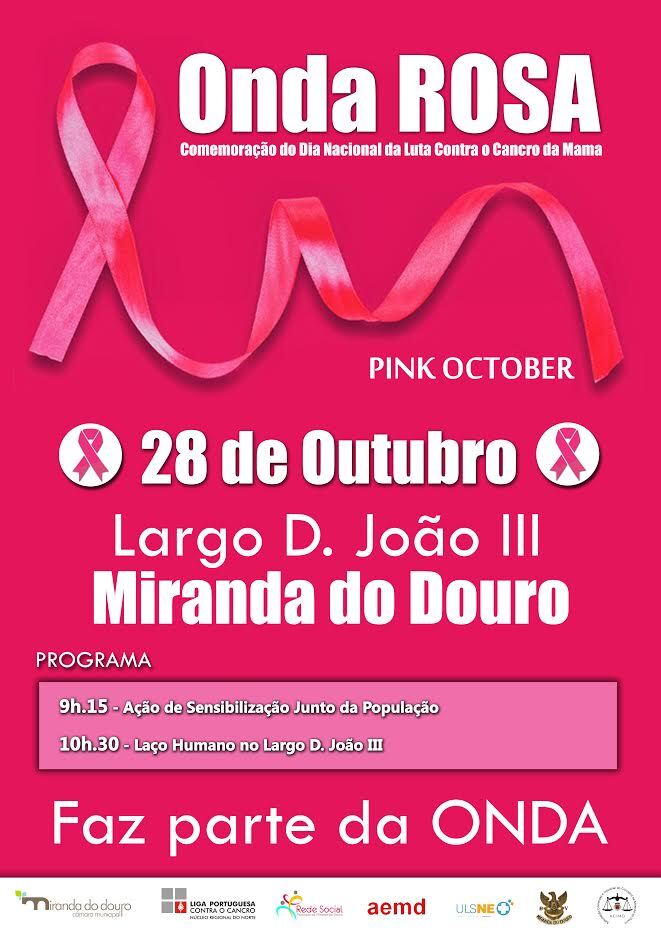 Comemoramos com a distribuição de folhetos informativos da Liga Portuguesa Contra o Cancro e Laços Rosa; Decoração das montras nas áreas comerciais em tom de rosa, Dia Rosa nas Instituições; Iluminação noturna do Edifício da Câmara, Laços rosa nas fachadas dos edifícios, Agrupamento de Escolas de Miranda do Douro, Centro de Saúde, Bombeiro e IPSS’s e outros; Mundo digital alusivo ao tema; atividade dinâmica no Polivalente da Escola Vertical Miranda do Douro e Laço Humano no Largo D. João III, às 10.30 horas.