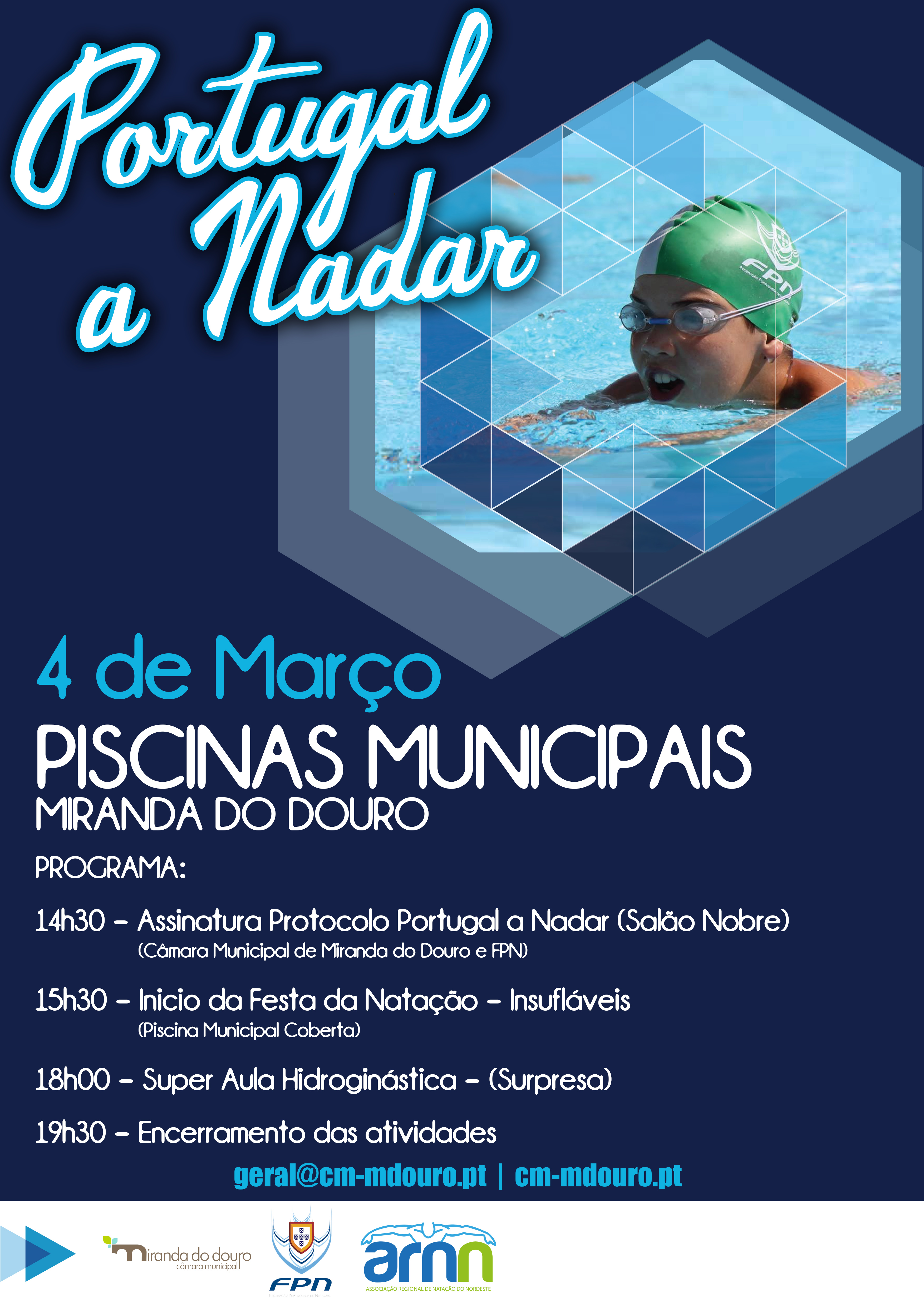 A Câmara Municipal de Miranda do Douro vai implementar o Programa Portugal a nadar, através de protocolo coma Federação Portuguesa de Natação, a celebrar no próximo dia 4 de Março, pelas 14h30 no Salão Nobre do Municipio, seguido de atividades diversas na Piscina Municipal Coberta.