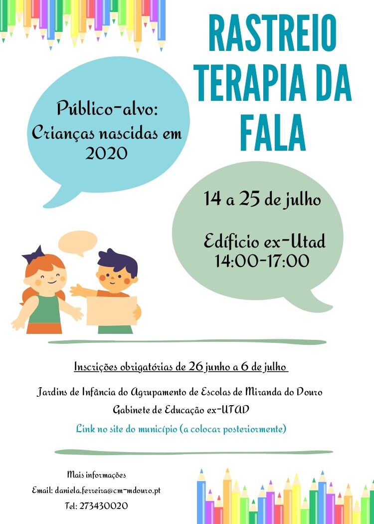 Entre os dias 14 e 25 de julho, a terapeuta da fala da Câmara Municipal de Miranda do Douro irá realizar um rastreio de terapia da fala para os alunos nascidos no ano de 2020 e que frequentam as escolas do agrupamento de Miranda do Douro. Esta iniciativa tem como objetivo identificar precocemente alterações de linguagem oral e na fala, bem como dificuldades relacionadas com a consciência fonológica.