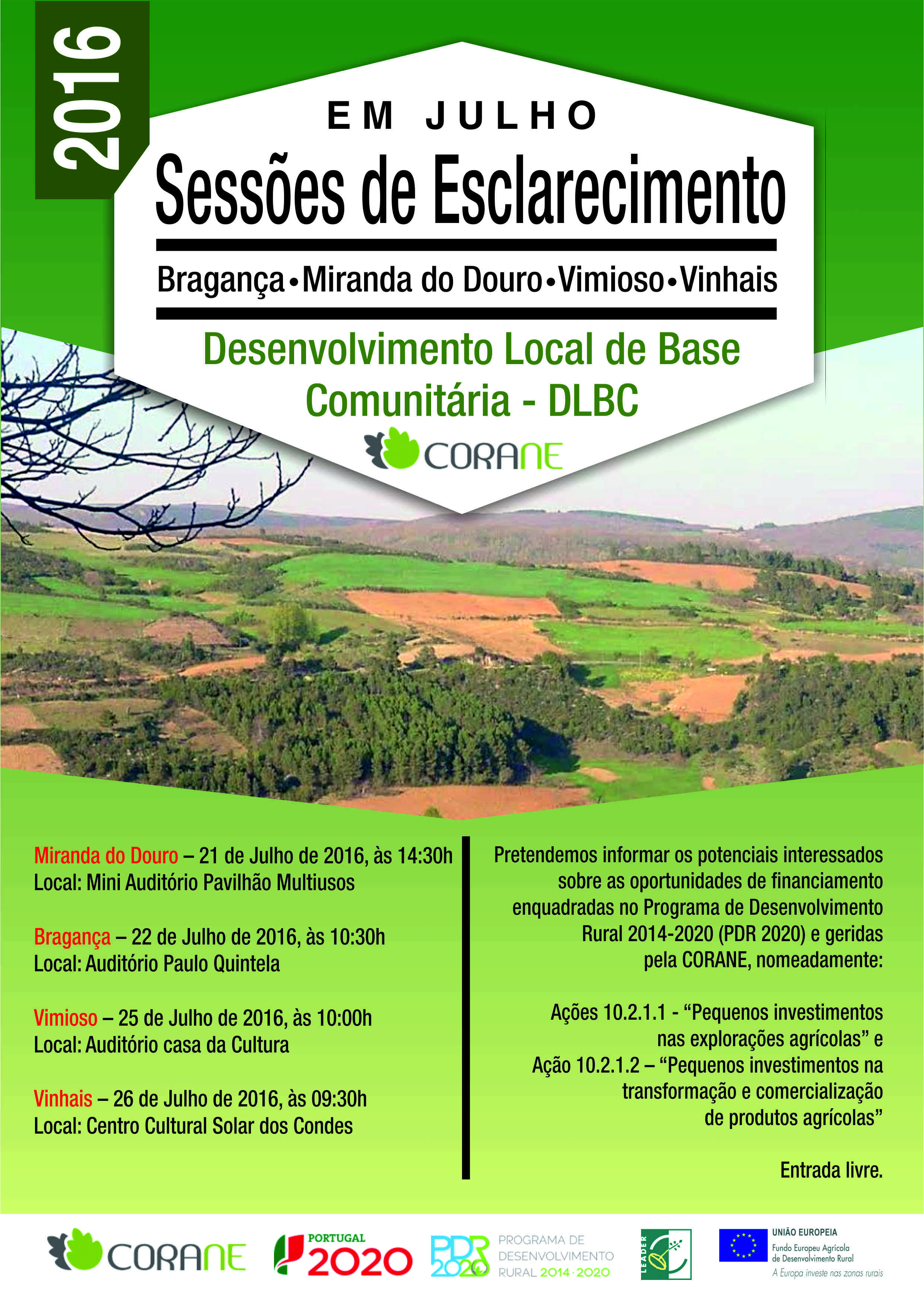 A Corane – Associação de Desenvolvimento da Raia Nordestina, em colaboração com Câmara Municipal de Miranda do Douro, vai realizar no próximo dia 21 de Julho, a partir das 14h30, no miniauditório de Miranda do Douro, uma sessão de esclarecimento sobre as Novas Candidaturas, no âmbito do PDR 2020.