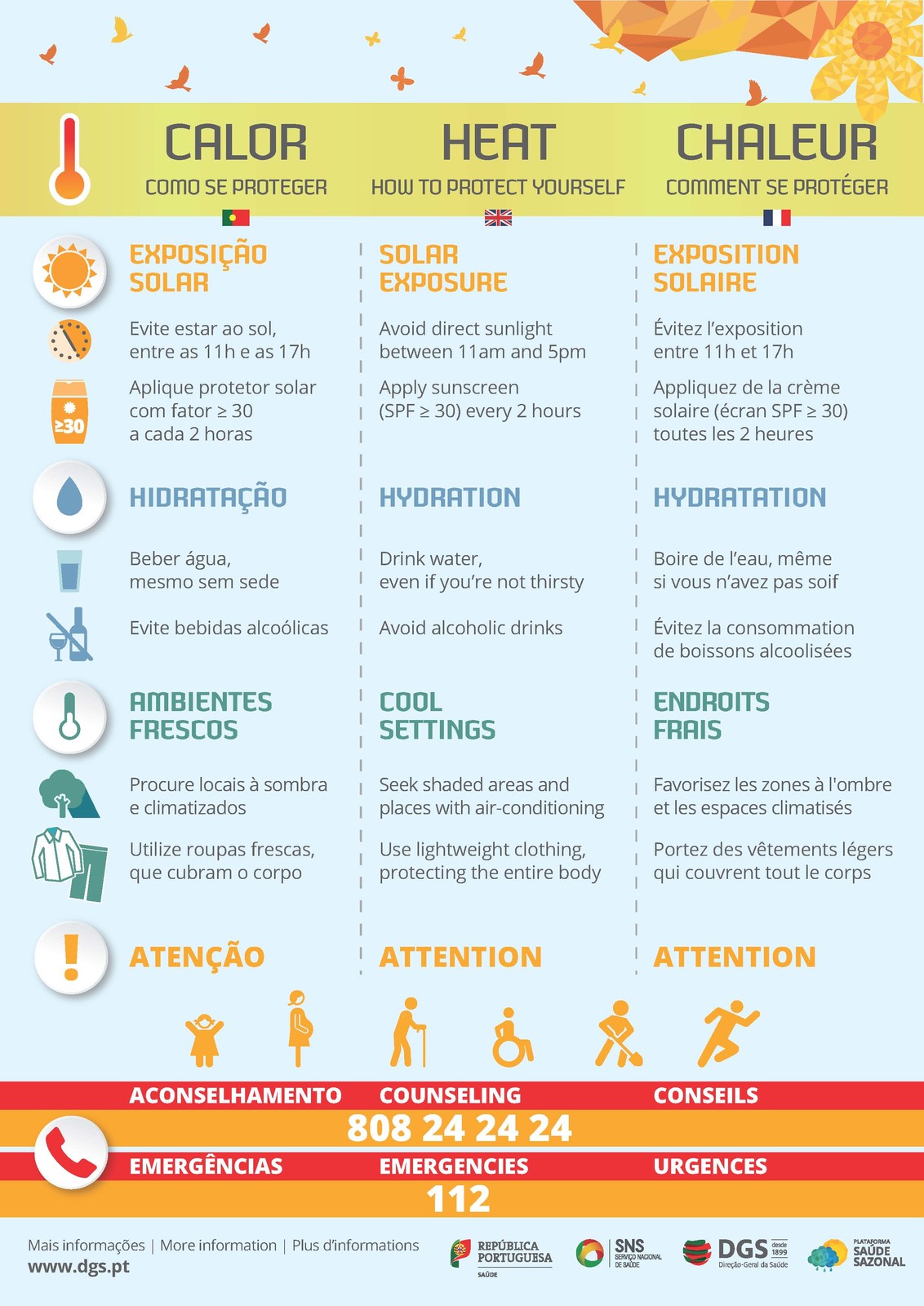 Considerando a previsão de temperaturas elevadas para os próximos dias e o risco de impacto na saúde solicitamos que siga as recomendações da DGS.
