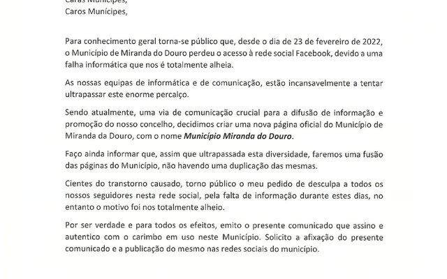 Comunicado | Rede Social Facebook, Município de Miranda do Douro