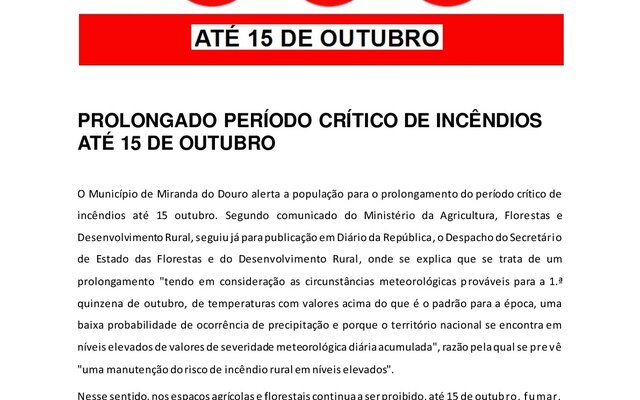 PROLONGADO PERÍODO CRÍTICO DE INCÊNDIOS ATÉ 15 DE OUTUBRO