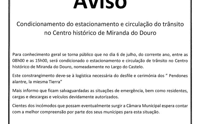 AVISO | Condicionamento do estacionamento e circulação no Centro Histórico de Miranda do Douro
