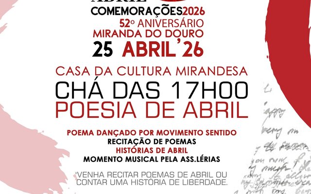 No âmbito das comemorações do 52.º aniversário do 25 de Abril, convidamo-lo para uma tarde onde a palavra e a música se encontram. A Casa da Cultura acolhe o "Chá das 17h00 – Poesia de Abril", um evento que celebra os valores da Liberdade através da arte. A tarde será ...